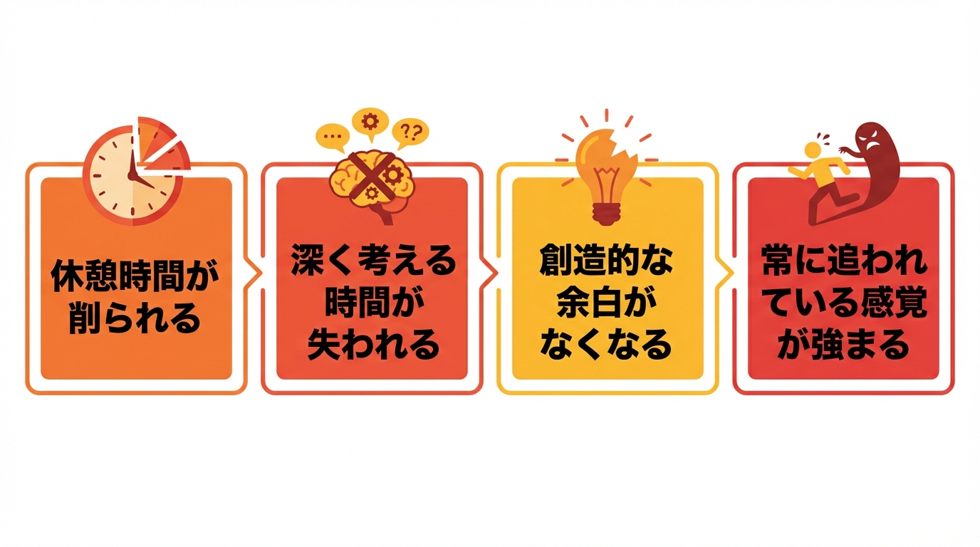 • 人間関係の希薄化:効率重視により、同僚との対話や協働の時間が削られる