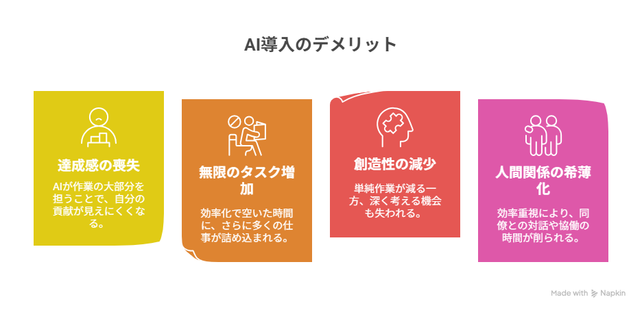 • 達成感の喪失:AIが作業の大部分を担うことで、自分の貢献が見えにくくなる